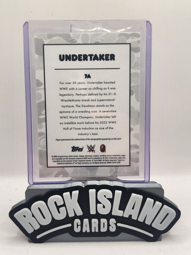 You are purchasing a Undertaker 2025 Topps WWE BAPE #7A Pink Camo 22/25. You will receive the exact item in the photographs. Thank you for looking.