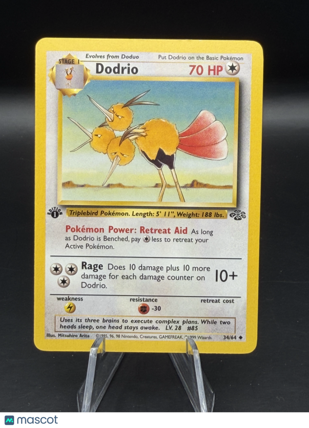 You are purchasing a Pokemon 1999 Jungle Dodrio Uncommon #34/64 - Lightly Played (Excellent). You will receive the exact item in the photographs. Thank you for looking.(Cards with multiple quantities under $20 each, will be the same condition, but not necessarily the exact same copy of the card.)