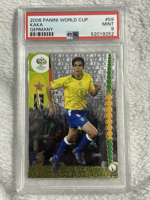 The product is a 2006 Panini World Cup trading card featuring Brazilian soccer player Kaka. This vintage card is from the base set of the FIFA World Cup collection, with a holographic foil design. The card is in English language and is part of the 2006 season, making it a sought-after collectible for fans of soccer trading cards.