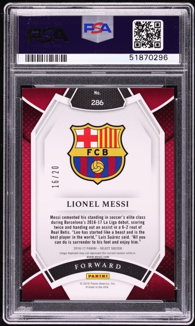 You are purchasing a 2016 Panini Select Lionel Messi #286 Camo Prizm /20 PSA 9. You will receive the exact item in the photographs. Thank you for looking.