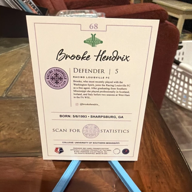 The 2021 Parkside NWSL trading card featuring Brooke Hendrix #68 (RC) is a standard-sized card made of card stock, manufactured by Parkside in the United States. This rookie card is part of the base set for the National Women's Soccer League (NWSL) season, with English language text and a 20 Pt. thickness. The card showcases Hendrix as a player for Racing Louisville FC, making it a must-have for soccer fans and collectors interested in NWSL memorabilia.
