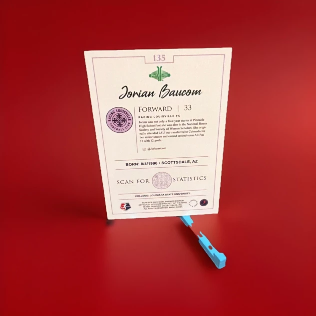 The 2021 Parkside NWSL trading card featuring Jorian Baucom #135 (RC) is a standard-sized sports trading card made of card stock. This rookie card from the National Women's Soccer League (NWSL) showcases the talented player from Racing Louisville FC. Manufactured by Parkside in the United States, this original card is part of the base set and is a must-have for soccer fans and trading card collectors alike.