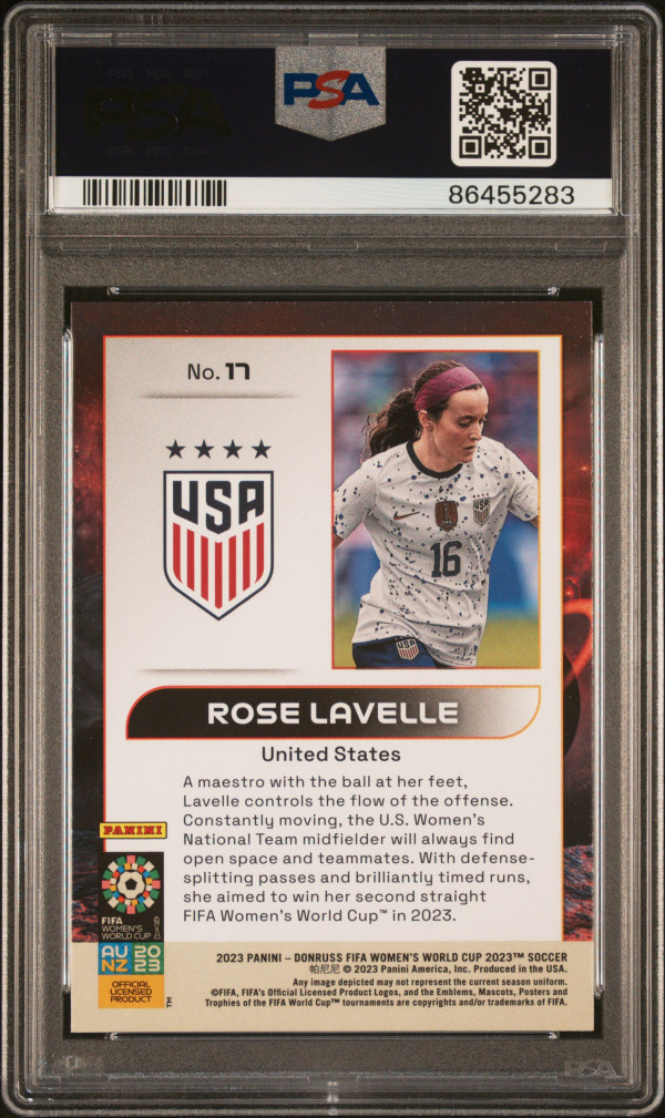 You are purchasing a 2023 Panini Donruss FIFA Women's World Cup Intergalactic Rose Lavelle #17 Insert PSA 9. You will receive the exact card in the photographs. Thank you for looking. Listed with Mascot.