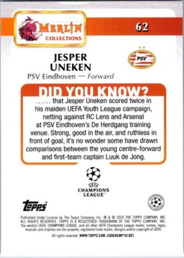 This is a nice example of a 2024-25 Merlin UEFA Club Competitions #62 Jesper Uneken Vintage Merlin Refractor