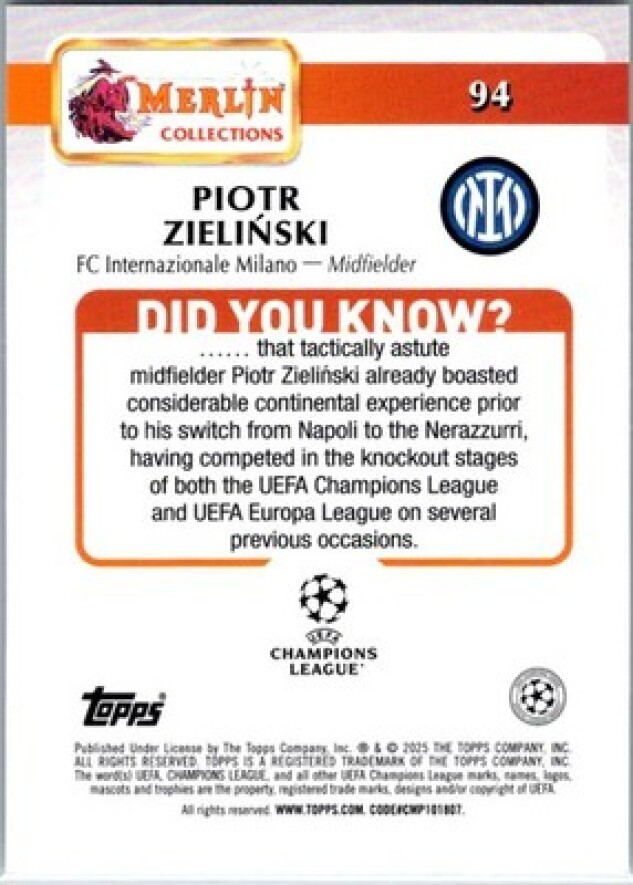 This is a nice example of a 2024-25 Merlin UEFA Club Competitions #94 Piotr Zieliński