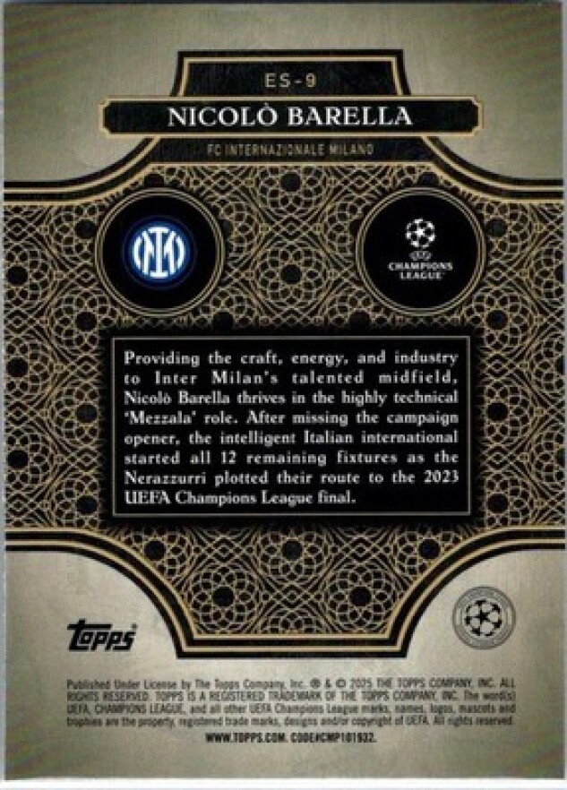 This is a nice example of a 2024-25 Merlin UEFA Club Competitions #ES-9 Nicolò Barella Elite Society