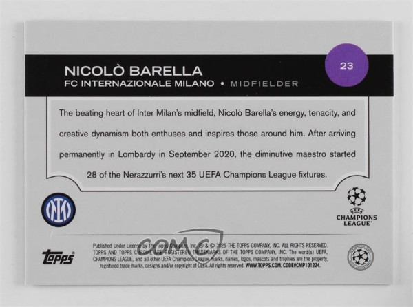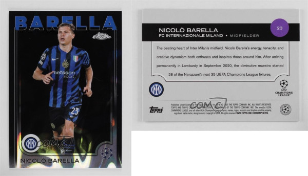 You are purchasing a 2024-25 Topps Chrome UEFA Club Competitions - [Base] - Black Lava Nicolo Barella #23 Black Lava Refractor 04/10. You will receive the exact item in the photographs. Thank you for looking.