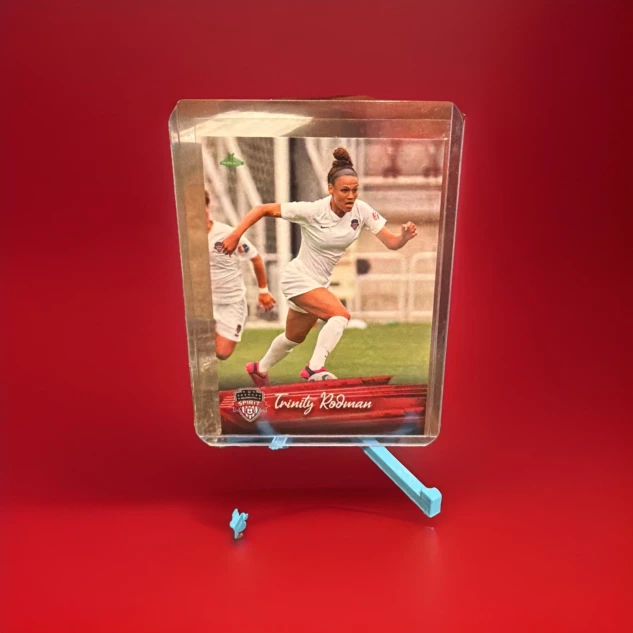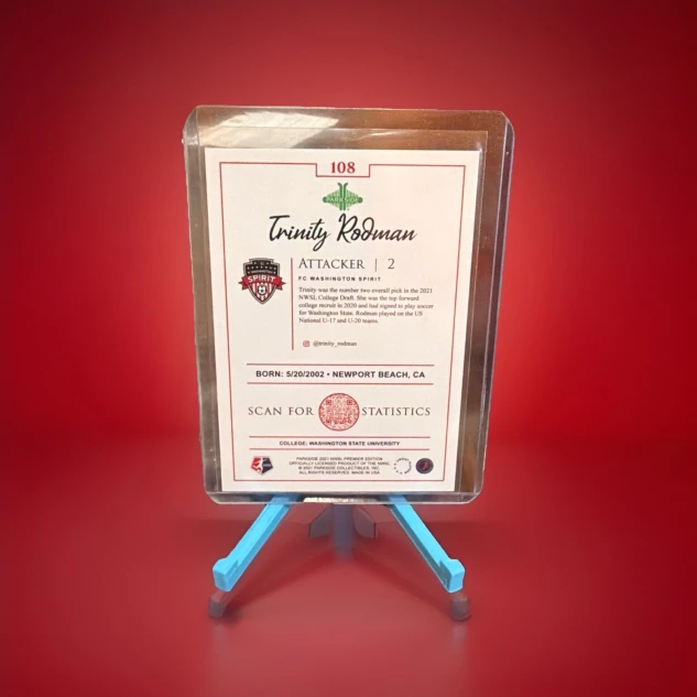 The product is a 2021 Parkside NWSL Trinity Rodman #108 rookie card featuring the player from the Washington Spirit in the National Women's Soccer League (NWSL). This original card, made of card stock with a 20 Pt. thickness, is a standard size sports trading card in English language. It is part of the base set and does not feature an autograph, making it a sought-after collectible for fans and collectors of soccer trading cards.