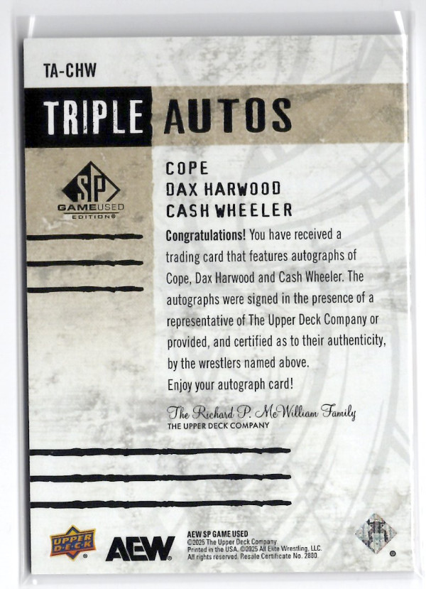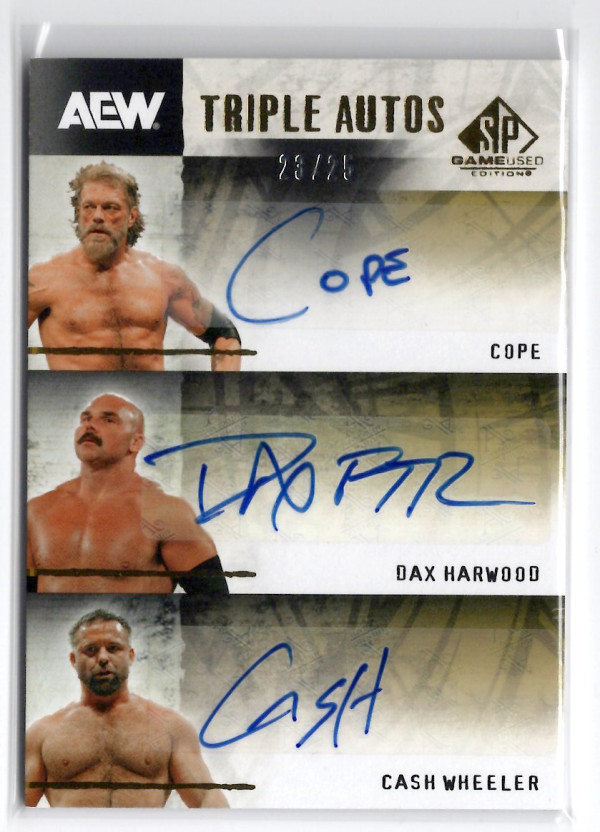2025 UD AEW SP GAME USED EDITION TRIPLE AUTOS #TA-CHW COPE/DAX HARWOOD/CASH WHEELER (23/25)