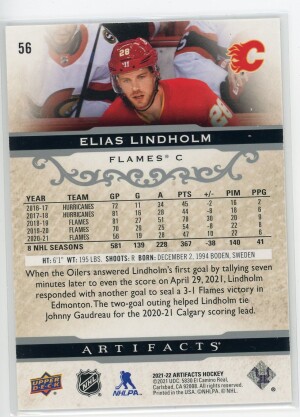 2021-22 Artifacts #56 Elias Lindholm Silver Spectrum /299