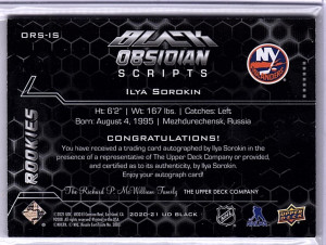 2020-21 UD Black Rookie Obsidian Scripts Ilya Sorokin