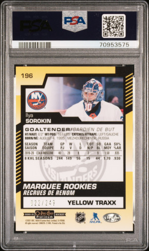 2020 O-Pee-Chee Platinum Ilya Sorokin Yellow Traxx Rookie