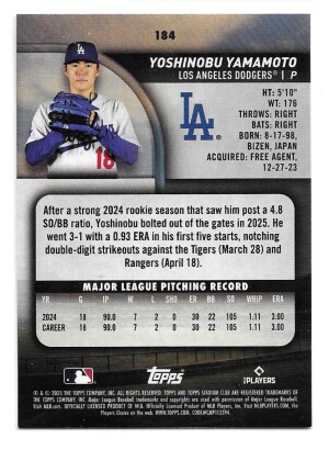 2025 Stadium Club Lime Green #184 Yoshinobu Yamamoto - Los Angeles Dodgers