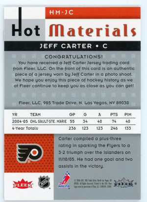 2005-06 Hot Prospects Jeff Carter Hot Materials Jersey #HM-JC