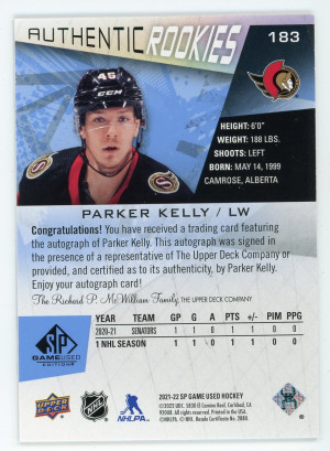 2021-22 SP Game Used #183 Parker Kelly Rookie Blue Autograph