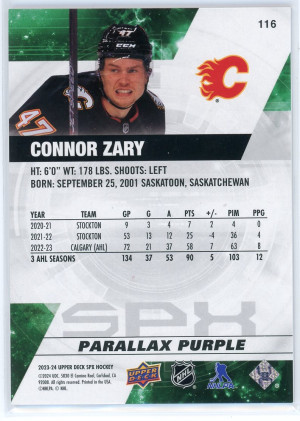 2023-24 SPx #116 Connor Zary Rookie Parallax Purple 80/149
