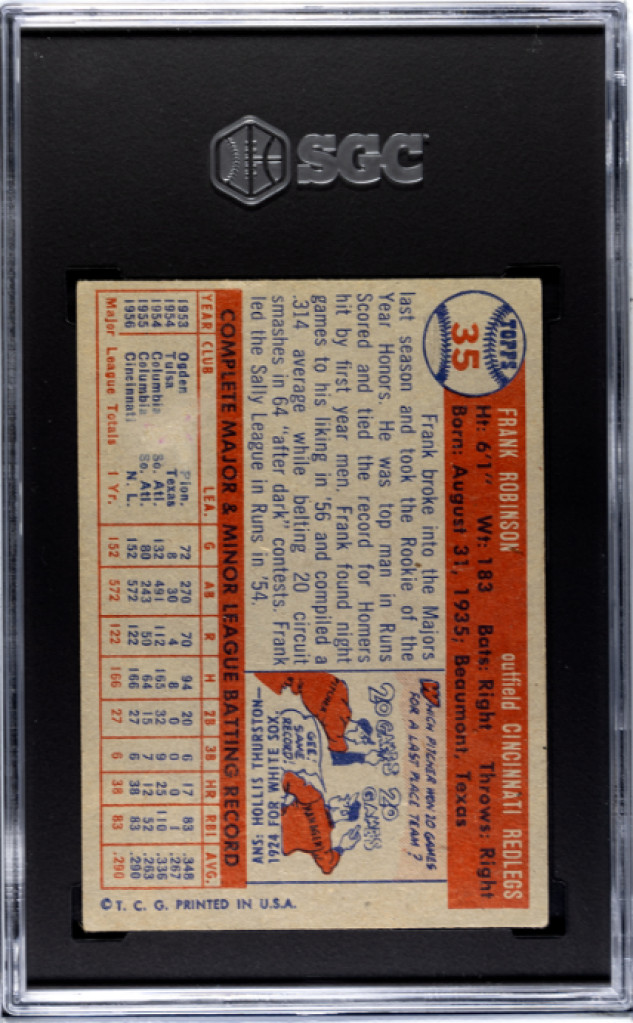 You are purchasing a 1957 Topps Frank Robinson SGC 1.5. Upon purchase you will receive the exact card pictured. Thanks!