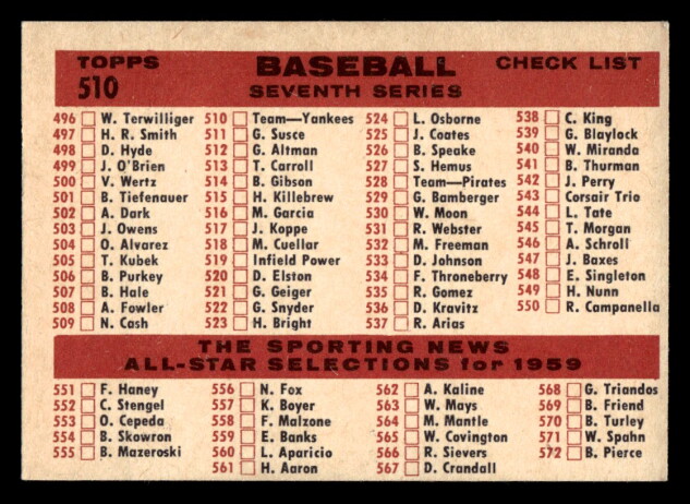 1959 Topps #510 New York Yankees CL Unmarked EX/MT NM (OC)