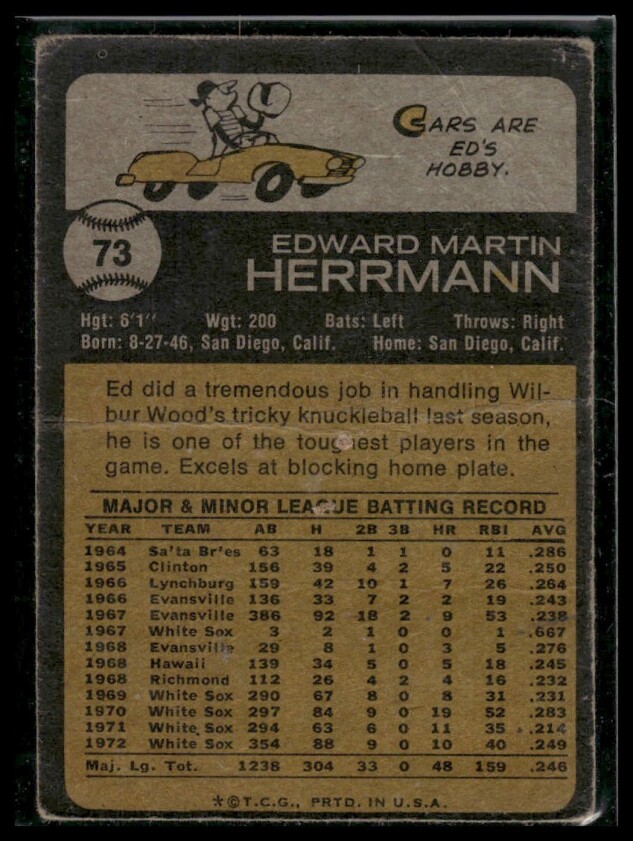 You are purchasing a 1973 Topps Ed Herrmann #73. You will receive the exact item in the photographs. Thank you for looking.