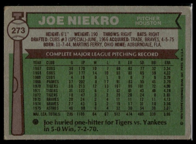 You are purchasing a 1976 Topps Joe Niekro #273. You will receive the exact item in the photographs. Thank you for looking.