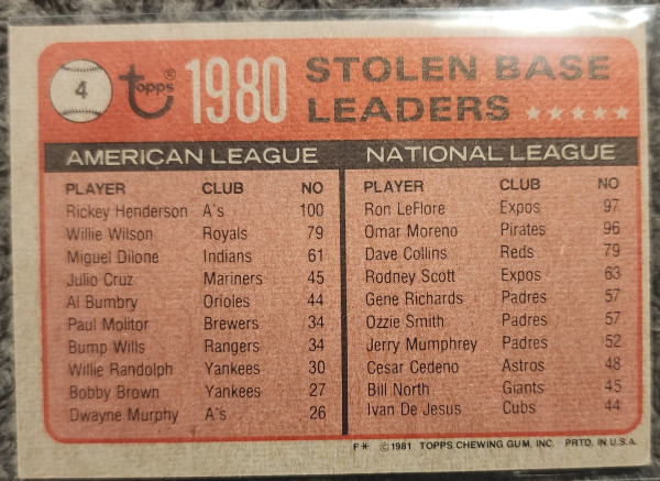 1981 Topps R. Henderson/ Ron LeFlore Stolen Base Leaders