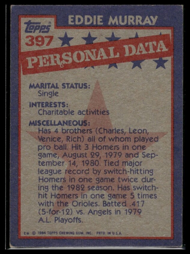 You are purchasing a 1984 Topps Eddie Murray #397. You will receive the exact item in the photographs. Thank you for looking.