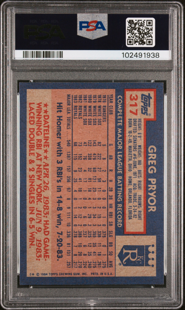 You are purchasing a { 1984 Topps Greg Pryor #317 PSA 8. You will receive the exact item in the photographs. Thank you for looking.
