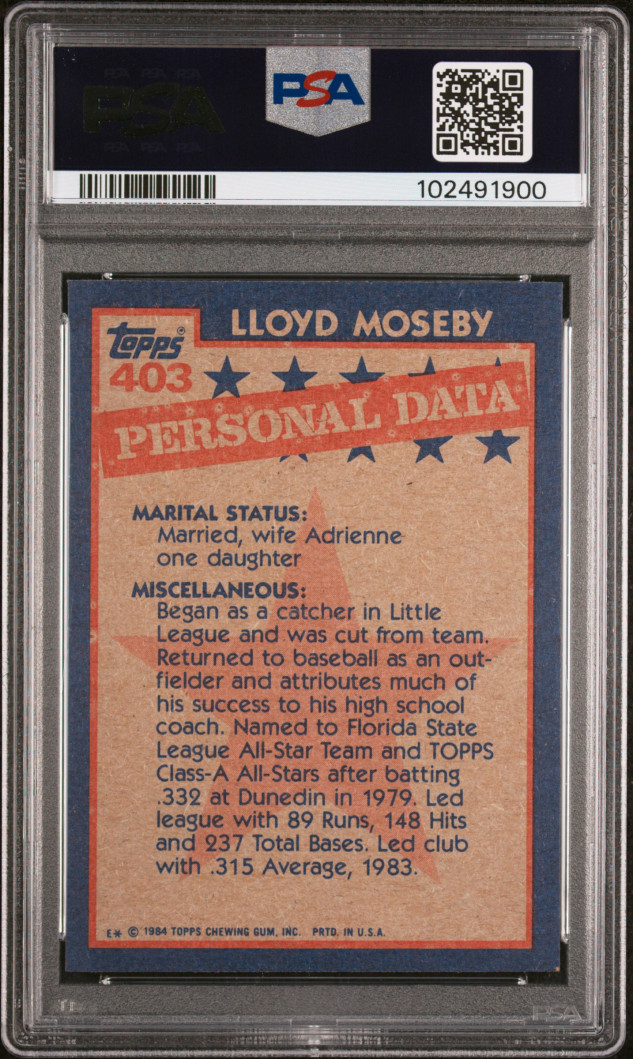 You are purchasing a { 1984 Topps Lloyd Moseby #403 PSA 9. You will receive the exact item in the photographs. Thank you for looking.
