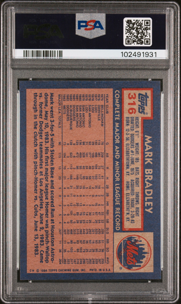 You are purchasing a { 1984 Topps Mark Bradley #316 PSA 8. You will receive the exact item in the photographs. Thank you for looking.
