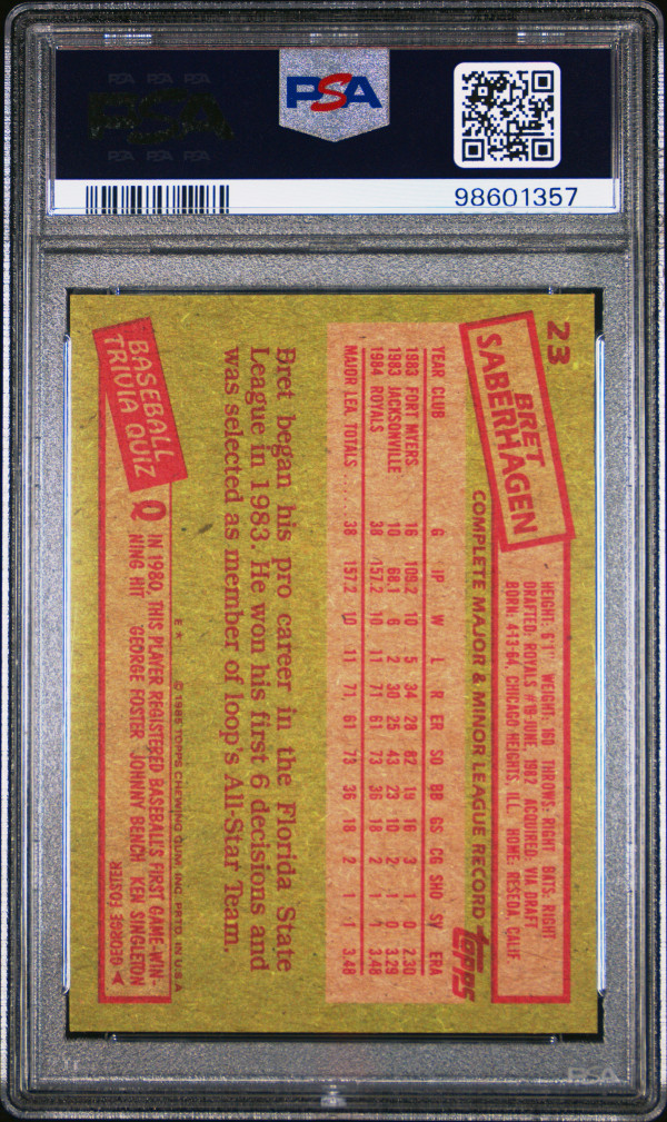 You are purchasing a { 1985 Topps Bret Saberhagen #23 PSA 9. You will receive the exact item in the photographs. Thank you for looking.