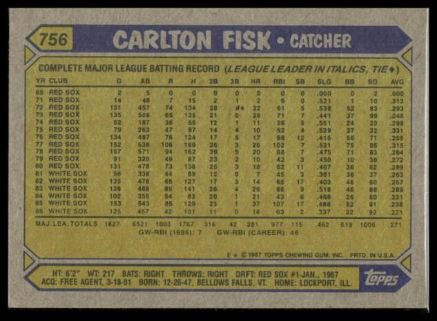 You are purchasing a 1987 Topps Carlton Fisk #756. You will receive the exact item in the photographs. Thank you for looking.