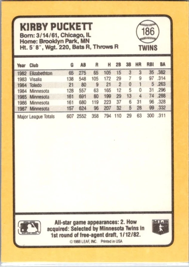 This is a nice example of a 1988 Donruss Baseball's Best #186 Kirby Puckett