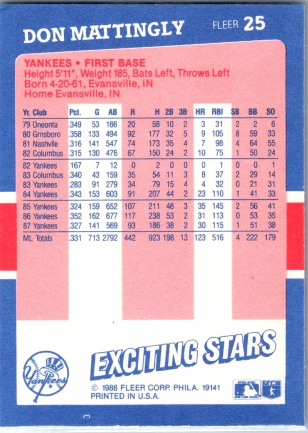 This is a nice example of a 1988 Fleer Baseball's Exciting Stars #25 Don Mattingly