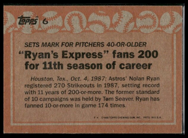 You are purchasing a 1988 Topps Nolan Ryan #6. You will receive the exact item in the photographs. Thank you for looking.