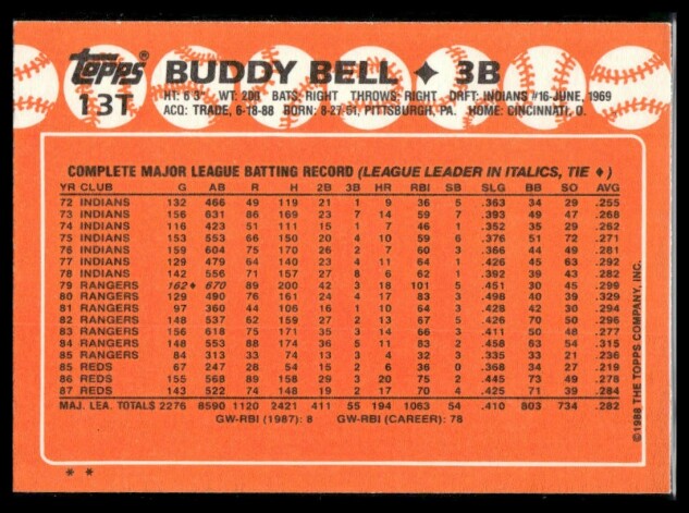 You are purchasing a 1988 Topps Traded Buddy Bell #13T. You will receive the exact item in the photographs. Thank you for looking.