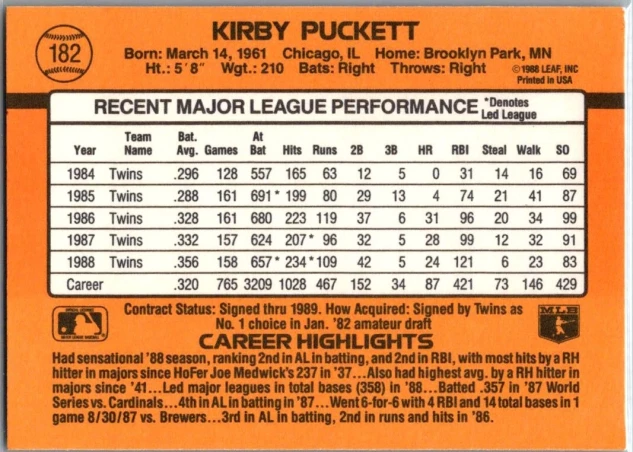 This is a nice example of a 1989 Donruss #182 Kirby Puckett