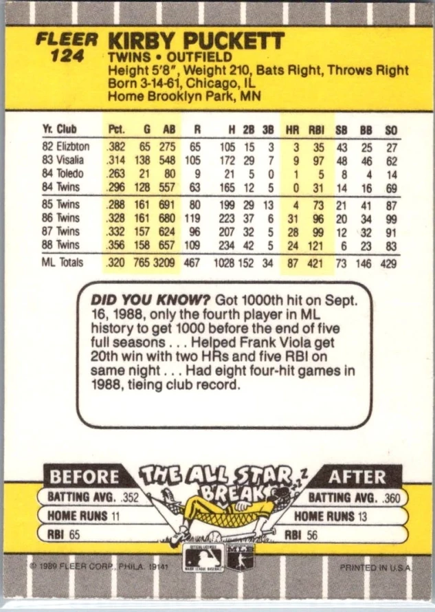 This is a nice example of a 1989 Fleer #124 Kirby Puckett