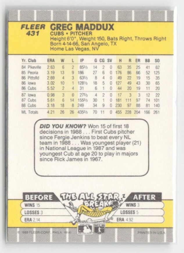 You are purchasing a 1989 Fleer Greg Maddux #431. You will receive the exact item in the photographs. Thank you for looking.