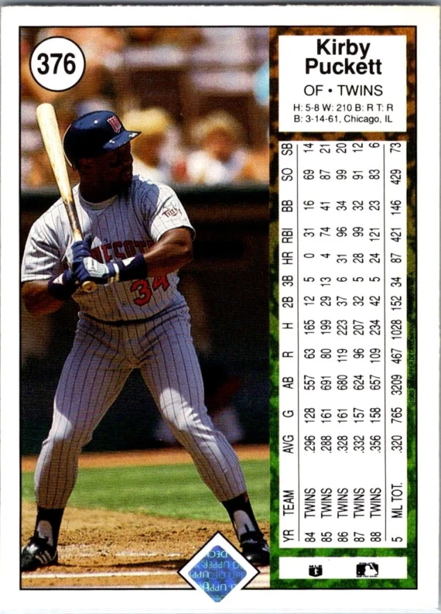 This is a nice example of a 1989 Upper Deck #376 Kirby Puckett
