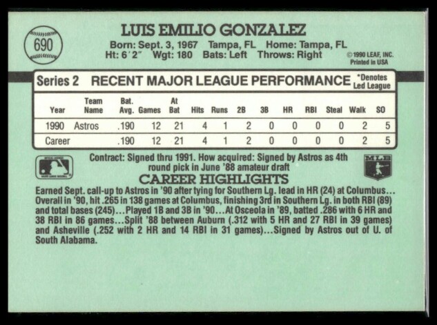 You are purchasing a 1991 Donruss Luis Gonzalez #690c RC. You will receive the exact item in the photographs. Thank you for looking.