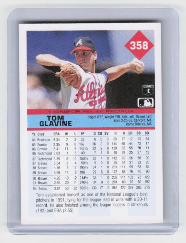 You are purchasing a 1992 Fleer Tom Glavine #358b. You will receive the exact item in the photographs. Thank you for looking.