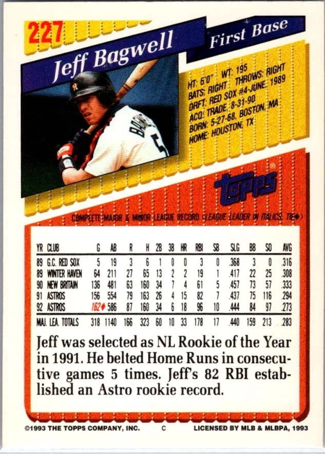 This is a nice example of a 1993 Topps #227 Jeff Bagwell