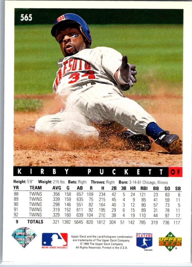 This is a nice example of a 1993 Upper Deck #565 Kirby Puckett Gold Hologram