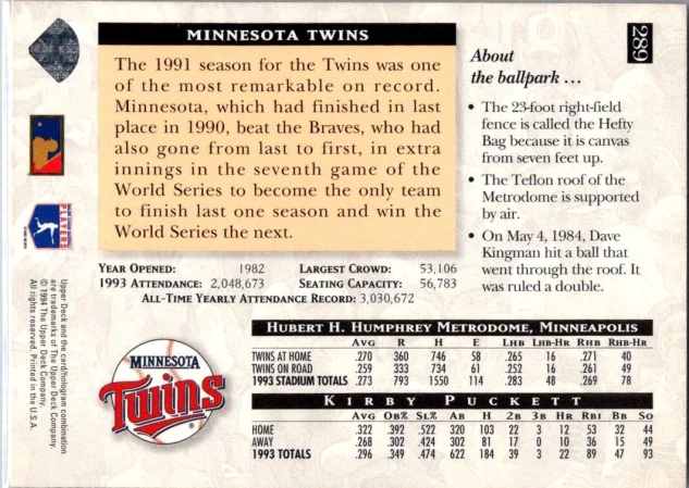 This is a nice example of a 1994 Upper Deck #289 Kirby Puckett
