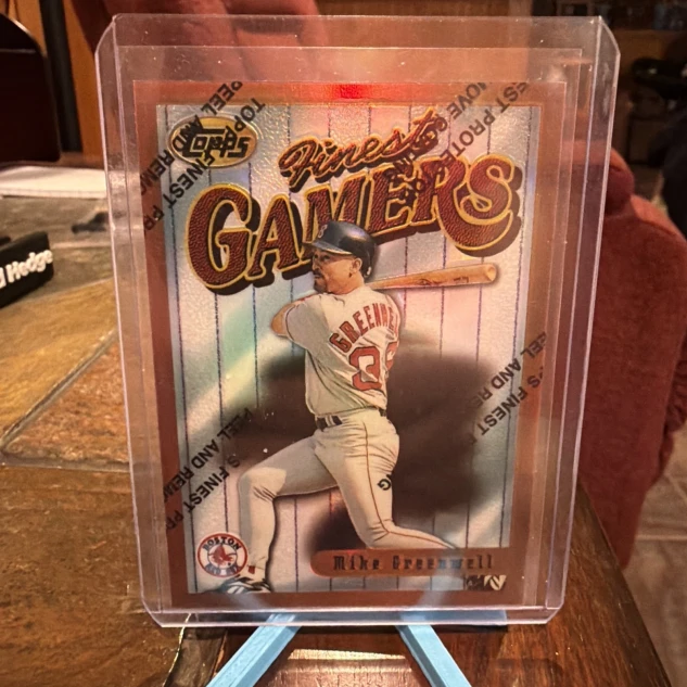 The product is a 1996 Topps Finest trading card featuring Mike Greenwell of the Boston Red Sox. This original card is a standard size made of card stock and is part of the Major League Baseball set for the 1996 season. The card is a Refractor parallel with a unique design, showcasing the player in his baseball uniform. It is a valuable collectible for baseball fans and card enthusiasts looking to add a piece of memorabilia from the 1990s to their collection.
