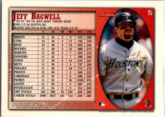 This is a nice example of a 1998 Bowman #15 Jeff Bagwell