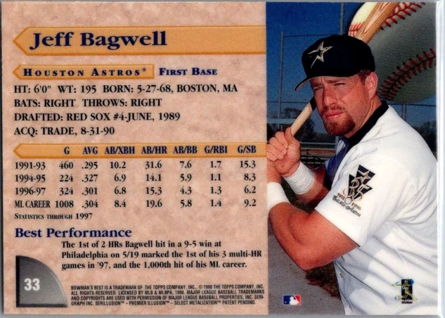 This is a nice example of a 1998 Bowman's Best #33 Jeff Bagwell