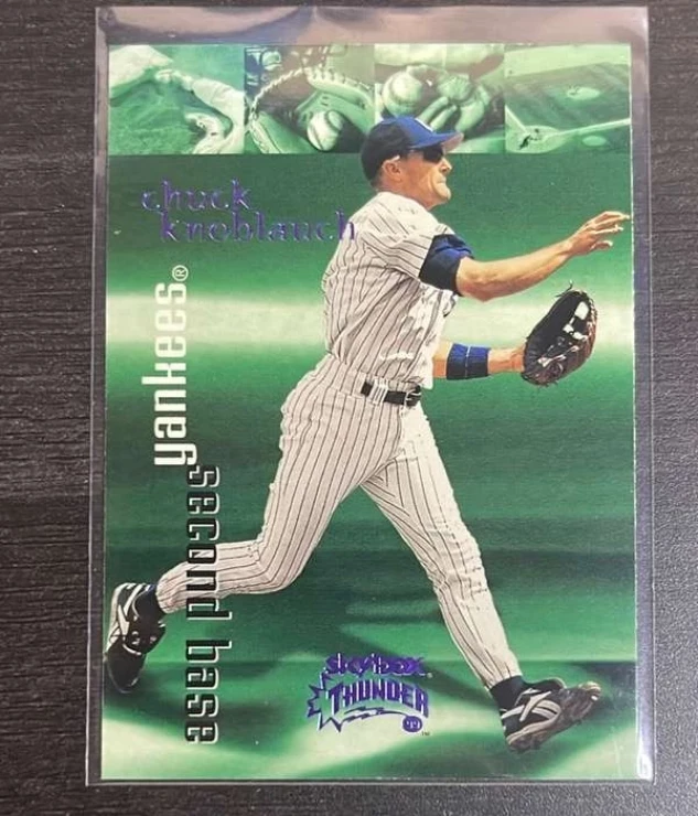 This is a nice example of a 1999 SkyBox Thunder #25 Chuck Knoblauch