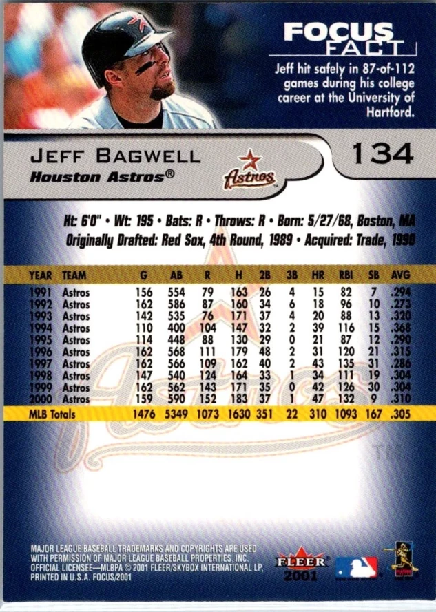 This is a nice example of a 2001 Fleer Focus #134 Jeff Bagwell