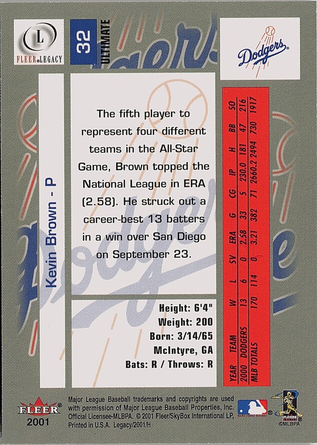 You are purchasing a 2001 Fleer Legacy Kevin Brown #32 Ultimate SN. You will receive the exact item in the photographs. Thank you for looking.